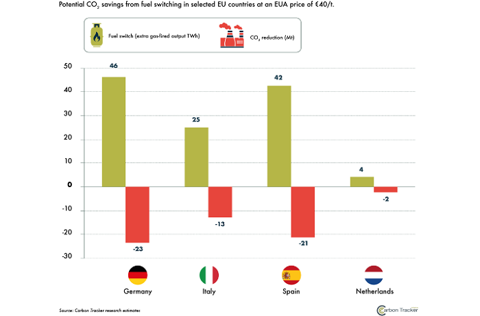 Le pari serait donc payant selon Carbon Tracker. Selon ses estimations, la hausse du prix de la tonne de carbone devrait en effet se poursuivre pour grimper jusqu’à 35 euros, voire 40 euros d’ici cinq ans. L’atteinte de la fourchette haute permettrait, selon le rapport, un changement de combustible plus rapide vers le gaz. Ce serait principalement le cas en Allemagne et en Espagne mais aussi, de façon moins importante, en Italie et aux Pays-Bas.