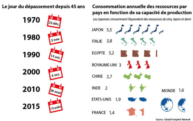 Cela signifie qu’en moins de huit mois, la population mondiale a, en théorie, déjà consommé toutes les ressources de la planète pour l’année 2015. À partir d’aujourd’hui, pour continuer à boire, à manger, à se chauffer, à se déplacer, à produire, nous vivons à crédit jusqu’au 31 décembre. Une “dette écologique” qui ne cesse de s’alourdir depuis 1970, et dont les conséquences sont déjà visibles : déforestation, sècheresse, érosion des sols, appauvrissement de la biodiversité, ou encore accumulation de carbone dans l’atmosphère.