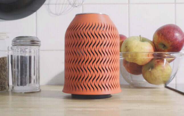 Cette enceinte coche toutes les cases ou presque du design durable. Elle utilise des produits recyclables, prévoit la fin de vie du produit, lutte contre l’obsolescence programmée et est issue d’un travail collaboratif. Le secret est l’utilisation de l’impression 3D pour concevoir la "cloche en dentelles" qui protège l’électronique. Celle-ci utilise des filaments issus à 30 % de pots de yaourts recyclés et 100 % de la bobine (sur laquelle le filament est enroulé) provient de la réutilisation de toners d’imprimantes usagés.