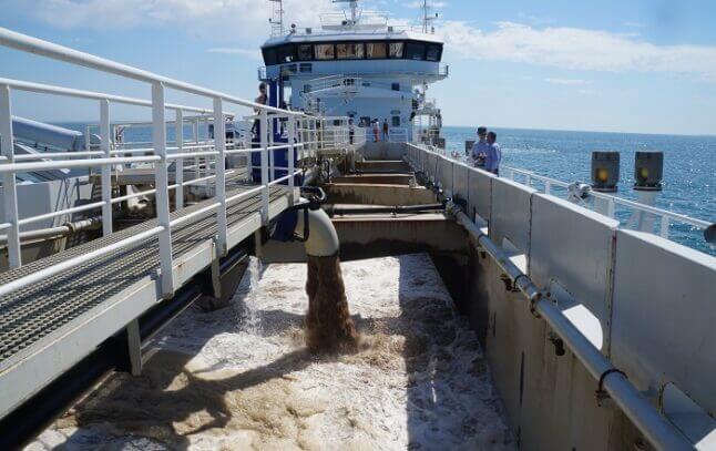 Les quatre cales du Stellamaris se remplissent peu à peu sous le bruit assourdissant des tuyaux qui crachent en continu le sable mélangé à l’eau. Le trop-plein est rejeté au fur et à mesure que nous avançons. À l’arrivée au port, il ne reste sous nos pieds que le nouvel or jaune du XXIe siècle. L’un des sept membres d’équipage jette l’ancre. Le navire est raccordé à un pipeline sur le port. Le déchargement peut commencer.