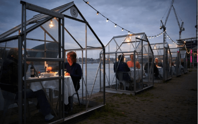 Des petites serres individuelles, voilà l’idée originale qu’a eu le centre culturel Mediamatic à Amsterdam aux Pays-Bas. Ces serres permettent de séparer les clients les uns des autres tandis que les serveurs portent des visières et des gants. Pour servir les plats ils s’aident d’une longue planche qu’ils introduisent dans la petite serre sans y entrer. Ce nouveau concept a été testé à plusieurs reprises par le restaurant qui va lancer ce dispositif fin mai. Le projet a été baptisé "Serres séparées", en français !