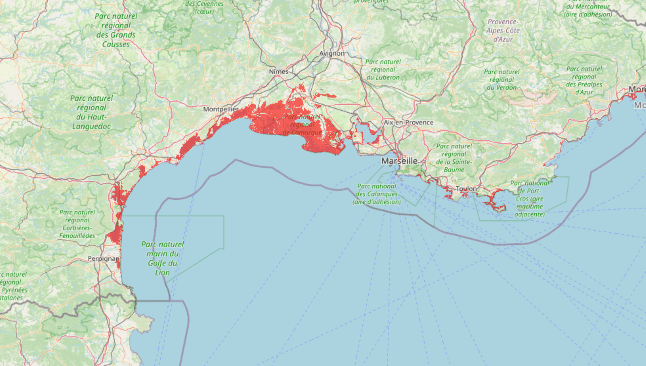 En France, près de 500 communes et 20% du littoral sont menacés. D’après une carte mise à disposition par le BRGM, la Camargue pourrait avoir entièrement disparu sous les eaux d’ici la fin du siècle. Les estuaires de la Gironde et de la Loire ne seront pas non plus épargnés. Au nord, la Manche avec la Côte d’Opale et ses polders naturels seront également fortement affectés.